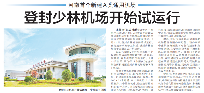 记者从中豫航空获悉,9月9日,我省首个新建A类通用机场登封少林机场取得民航中南地区管理局颁发的使用许可证。9月11日,登封少林机场开始试运行。在完成各项筹备工作后,登封少林机场将于近期正式开航运营。(今日《郑州日报》5版)