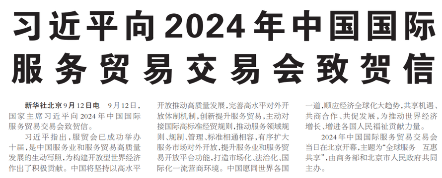 9月12日,国家主席习近平向2024年中国国际服务贸易交易会致贺信。