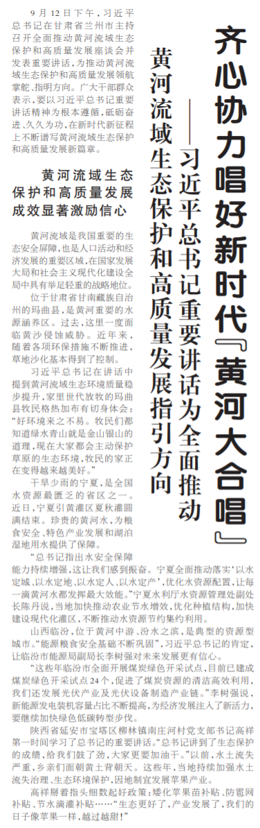 9月12日下午,习近平总书记在甘肃省兰州市主持召开全面推动黄河流域生态保护和高质量发展座谈会并发表重要讲话,为推动黄河流域生态保护和高质量发展领航掌舵、指明方向。广大干部群众表示,要以习近平总书记重要讲话精神为根本遵循,砥砺奋进、久久为功,在新时代新征程上不断谱写黄河流域生态保护和高质量发展新篇章。(今日《人民日报》1版)