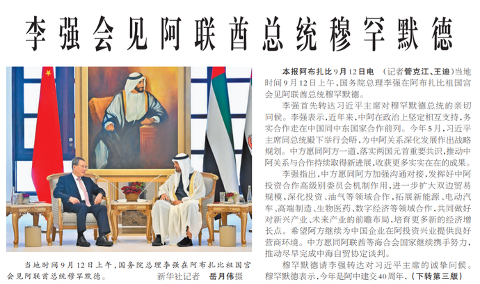 当地时间9月12日上午,国务院总理李强在阿布扎比祖国宫会见阿联酋总统穆罕默德。(今日《人民日报》1版、3版)