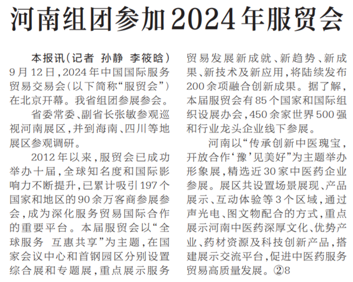 9月12日,2024年中国国际服务贸易交易会(以下简称“服贸会”)在北京开幕。我省组团参展参会。(今日《河南日报》2版)