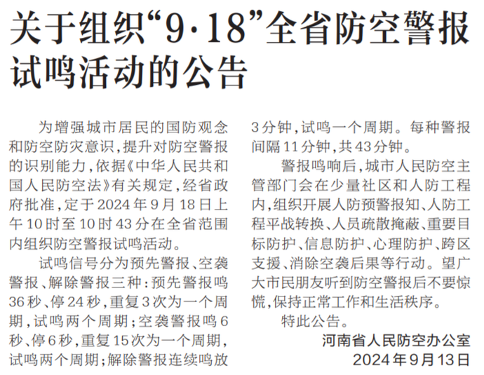 为增强城市居民的国防观念和防空防灾意识,提升对防空警报的识别能力,依据《中华人民共和国人民防空法》有关规定,经省政府批准,定于2024年9月18日上午10时至10时43分在全省范围内组织防空警报试鸣活动。(今日《河南日报》2版)
