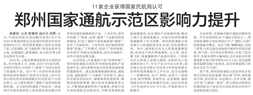 近日,中国民用航空局运输司发布《关于对2023年度通用航空企业诚信经营评价初评结果的公示》,郑州国家通航示范区内河南三和、正直通航、炫飞通航等7家企业获评为A级,永翔通航、蓝翔通航、圣大航空等4家企业获评为B级。(今日《郑州日报》3版)