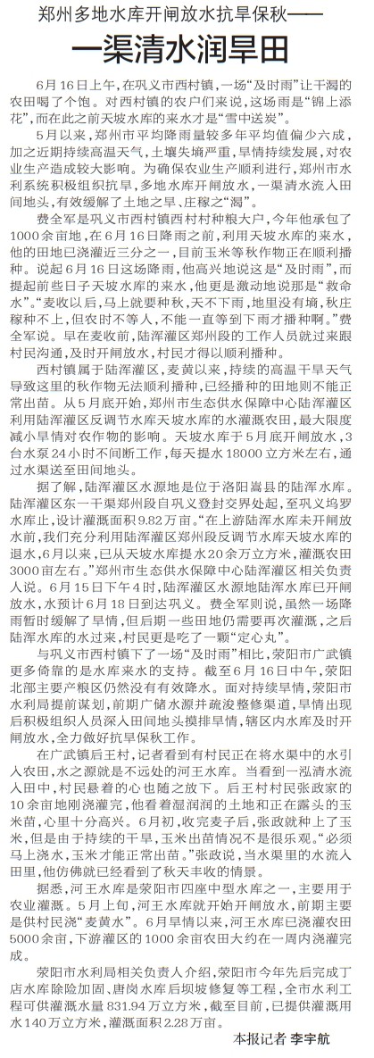 6月16日上午,在巩义市西村镇,一场“及时雨”让干渴的农田喝了个饱。对西村镇的农户们来说,这场雨是“锦上添花”,而在此之前天坡水库的来水才是“雪中送炭”。(今日《郑州日报》3版)