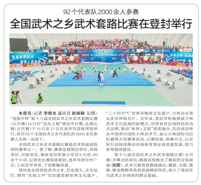 “旭源升杯”第十八届全国武术之乡武术套路比赛(公开赛)15日在“功夫之都”登封市开幕,此番比赛(公开赛)于15日至17日在该市均美体育馆举行,来自92个全国武术之乡代表队的2000余名参赛人员将一决高下。(今日《郑州日报》3版)