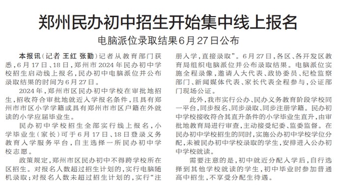 记者从教育部门获悉,6月17日、18日,郑州市2024年民办初中学校招生启动线上报名,民办初中电脑派位并公布录取结果的时间为6月27日。(今日《郑州日报》3版)