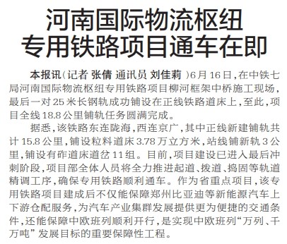 6月16日,在中铁七局河南国际物流枢纽专用铁路项目柳河框架中桥施工现场,最后一对25米长钢轨成功铺设在正线铁路道床上,至此,项目全线18.8公里铺轨任务圆满完成。(今日《郑州日报》3版)