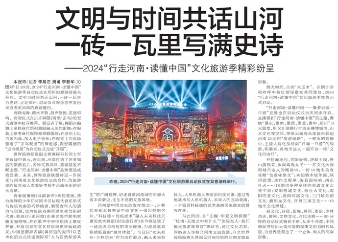 昨日20时,2024“行走河南·读懂中国”文化旅游季启动仪式在郑州如意湖旁盛大开启。文明与时间共话山河,一砖一瓦皆为史诗,立足郑州,启动仪式向全世界发出来自老家河南的真诚邀约。(今日《郑州日报》6版)