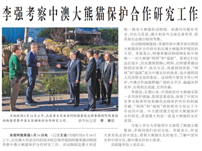 当地时间6月16日上午,正在澳大利亚访问的国务院总理李强到阿德莱德动物园考察中澳大熊猫保护合作研究工作。该动物园是澳大利亚唯一拥有大熊猫的动物园。南澳州州督孙芳安、州长马思诺,澳大利亚外交部长黄英贤、贸易部长法瑞尔陪同考察。(今日《人民日报》1版)