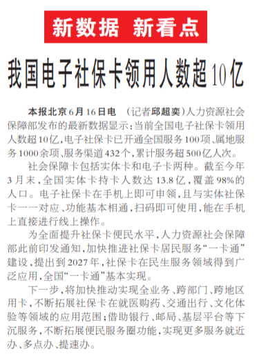 人力资源社会保障部发布的最新数据显示:当前全国电子社保卡领用人数超10亿,电子社保卡已开通全国服务100项、属地服务1000余项、服务渠道432个,累计服务超500亿人次。(今日《人民日报》1版)