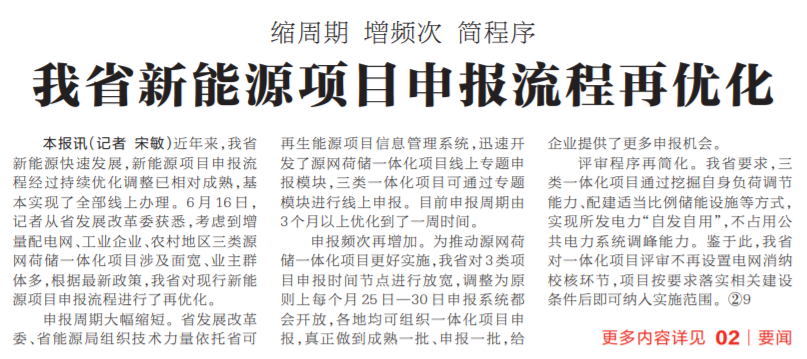 近年来,我省新能源快速发展,新能源项目申报流程经过持续优化调整已相对成熟,基本实现了全部线上办理。6月16日,记者从省发展改革委获悉,考虑到增量配电网、工业企业、农村地区三类源网荷储一体化项目涉及面宽、业主群体多,根据最新政策,我省对现行新能源项目申报流程进行了再优化。(今日《河南日报》1版)