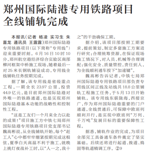 郑州国际陆港专用铁路项目(以下简称“专用线”)迎来重要时刻。6月16日10时10分,郑州航空港经济综合实验区南部柳河框架中桥施工现场,随着最后一对25米长钢轨铺设成功,专用线全线铺轨任务按期完成。(今日《河南日报》2版)