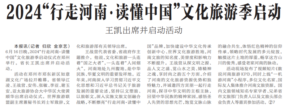 6月16日晚,2024“行走河南·读懂中国”文化旅游季启动仪式在郑州举行。省长王凯出席并启动活动。