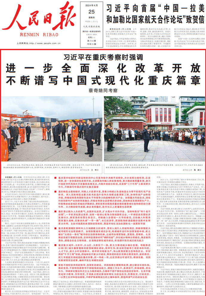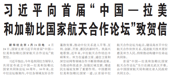 4月24日,国家主席习近平向首届“中国—拉美和加勒比国家航天合作论坛”致贺信。(今日《人民日报》1版)