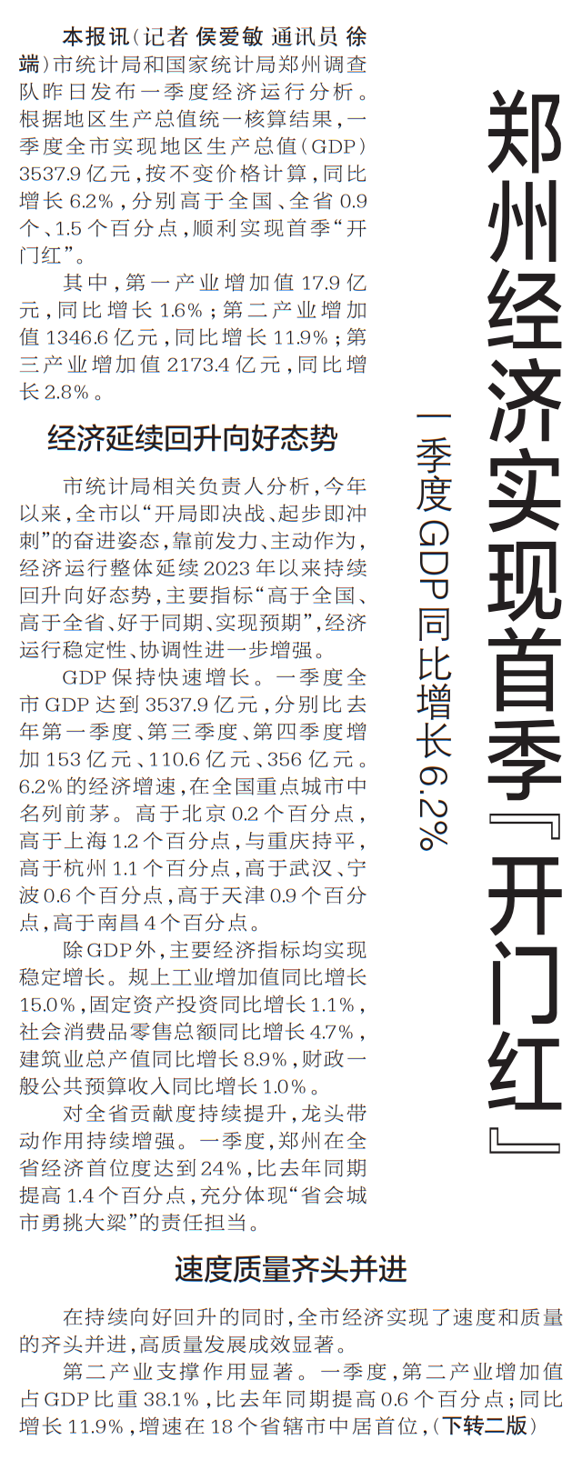 市统计局和国家统计局郑州调查队昨日发布一季度经济运行分析。根据地区生产总值统一核算结果,一季度全市实现地区生产总值(GDP)3537.9亿元,按不变价格计算,同比增长6.2%,分别高于全国、全省0.9个、1.5个百分点,顺利实现首季“开门红”。(今日《郑州日报》1版、2版)