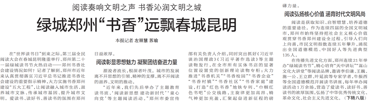在“世界读书日”到来之际,第三届全民阅读大会在春城昆明隆重举行、郑州第二十一届绿城读书节火热启动——郑州书香社会建设情况如何?记者了解到,郑州市近年来认真贯彻落实习近平总书记推进书香社会建设的重要指示精神,大力实施书香郑州建设“五大工程”,让阅读融入城市生活、滋养城市文脉、传承城市基因、提升城市文明。爱读书、读好书、善读书的氛围在郑州日益浓厚。(今日《郑州日报》1版、8版)