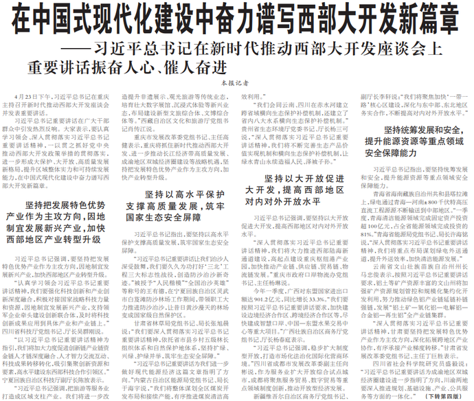 4月23日下午,习近平总书记在重庆主持召开新时代推动西部大开发座谈会并发表重要讲话。