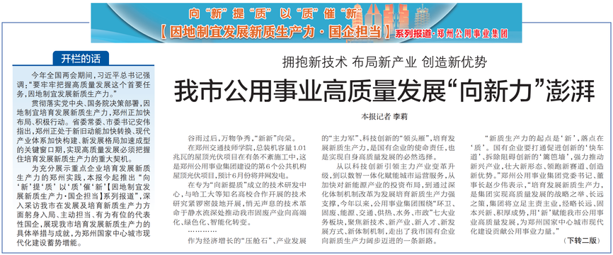 为充分展示重点企业培育发展新质生产力的郑州实践,本报今起推出 “向‘新’提‘质’ 以‘质’催‘新’【因地制宜发展新质生产力·国企担当】系列报道”,深入采访我市在发展及培育新质生产力方面躬身入局、主动担当、有为有位的代表性国企,展现我市培育发展新质生产力的具体举措与成就,为郑州国家中心城市现代化建设蓄势增能。