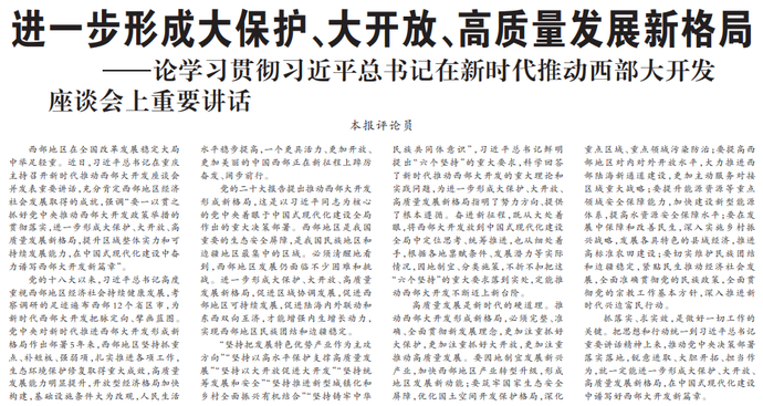 西部地区在全国改革发展稳定大局中举足轻重。近日,习近平总书记在重庆主持召开新时代推动西部大开发座谈会并发表重要讲话,充分肯定西部地区经济社会发展取得的成就,强调“要一以贯之抓好党中央推动西部大开发政策举措的贯彻落实,进一步形成大保护、大开放、高质量发展新格局,提升区域整体实力和可持续发展能力,在中国式现代化建设中奋力谱写西部大开发新篇章”。(今日《人民日报》2版)