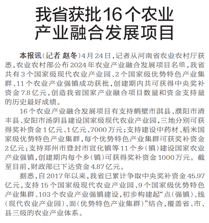 4月24日,记者从河南省农业农村厅获悉,农业农村部公布2024年农业产业融合发展项目名单,我省共有3个国家级现代农业产业园、2个国家级优势特色产业集群、11个农业产业强镇成功获批,创建期内共可获得中央奖补资金7.8亿元,创造我省国家产业融合项目数量和资金支持量的历史最好成绩。(今日《郑州日报》2版)