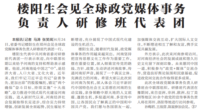 4月24日,省委书记楼阳生在郑州会见全球政党媒体事务负责人研修班代表团一行。(今日《河南日报》1版)