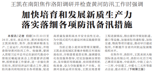 4月23日至24日,省长、省总河长、黄河省级河长王凯到南阳、焦作、洛阳调研粮食生产、工业运行、内河航运等情况,并检查指导黄河防汛工作。他强调,要深入贯彻习近平总书记在新时代推动中部地区崛起座谈会上的重要讲话精神,按照省委工作要求,进一步强化责任担当,抓好经济运行重点工作,落实防汛备汛和校园安全各项措施,促进高质量发展和高水平安全良性互动,为中国式现代化建设河南实践提供坚实支撑。(今日《河南日报》1版、3版)