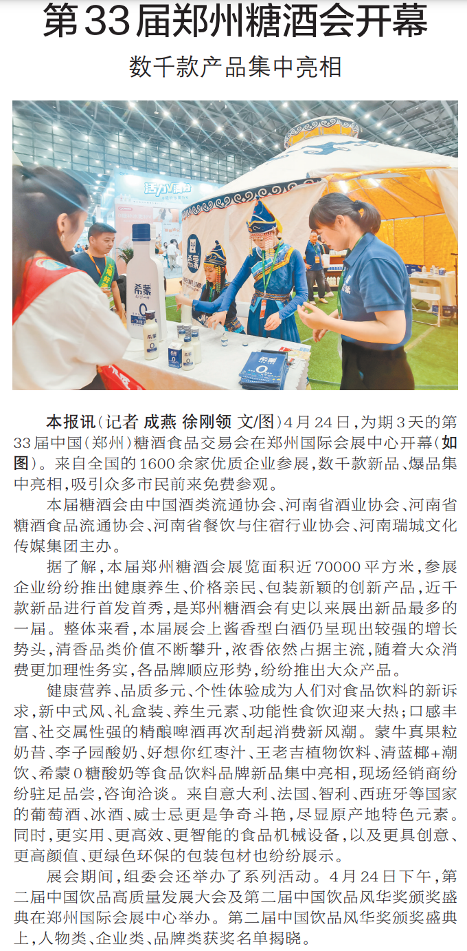 4月24日,为期3天的第33届中国(郑州)糖酒食品交易会在郑州国际会展中心开幕。来自全国的1600余家优质企业参展,数千款新品、爆品集中亮相,吸引众多市民前来免费参观。(今日《郑州日报》2版)