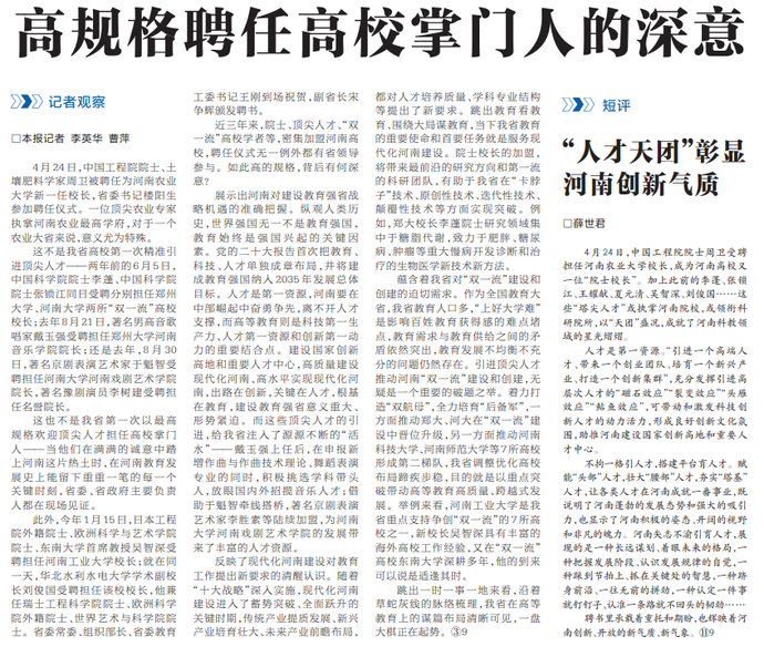 4月24日,中国工程院院士周卫受聘担任河南农业大学校长,成为河南高校又一位“院士校长”。加上此前的李蓬、张锁江、王耀献、夏元清、吴智深、刘俊国……这些“塔尖人才”或执掌河南院校,或领衔科研院所,以“天团”盛况,成就了河南科教领域的星光熠熠。(今日《河南日报》2版)