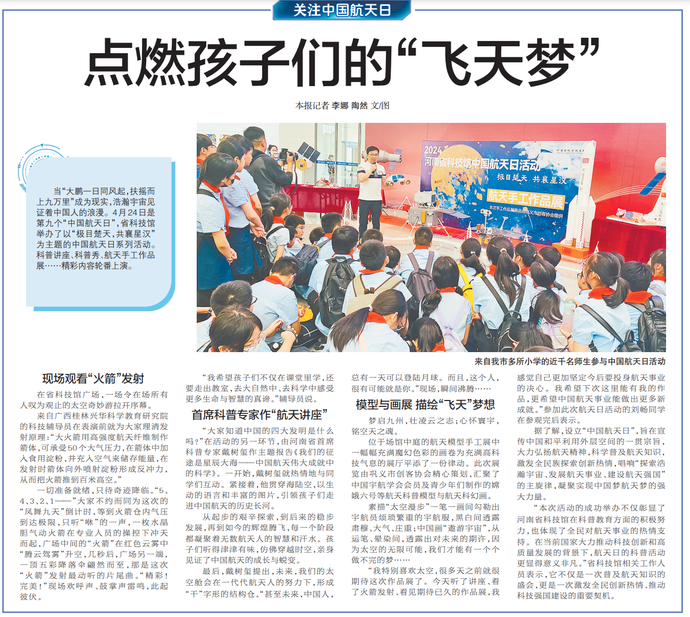 当“大鹏一日同风起,扶摇而上九万里”成为现实,浩瀚宇宙见证着中国人的浪漫。4月24日是第九个“中国航天日”,省科技馆举办了以“极目楚天,共襄星汉”为主题的中国航天日系列活动。科普讲座、科普秀、航天手工作品展……精彩内容轮番上演。(今日《郑州日报》5版)