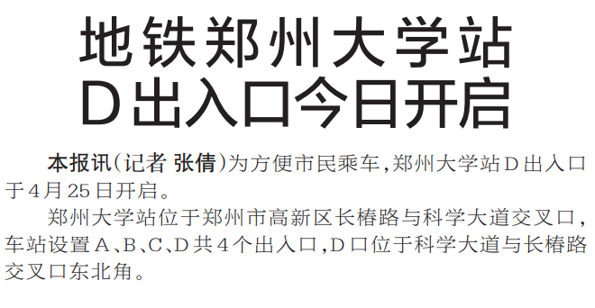 为方便市民乘车,郑州大学站D出入口于4月25日开启。(今日《郑州日报》5版)