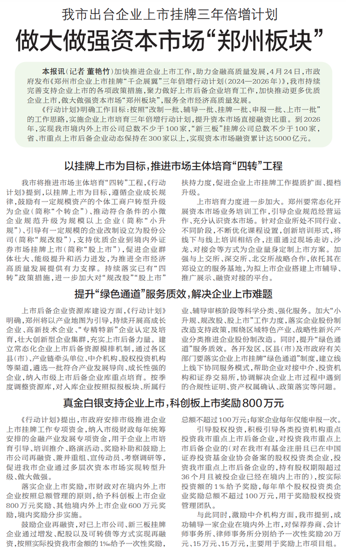 加快推进企业上市工作,助力金融高质量发展,4月24日,市政府发布《郑州市企业上市挂牌“千企展翼”三年倍增行动计划(2024—2026年)》,我市持续完善支持企业上市的各项政策措施,聚力做好上市后备企业培育工作,加快推动更多优质企业上市,做大做强资本市场“郑州板块”,服务全市经济高质量发展。(今日《郑州日报》6版)