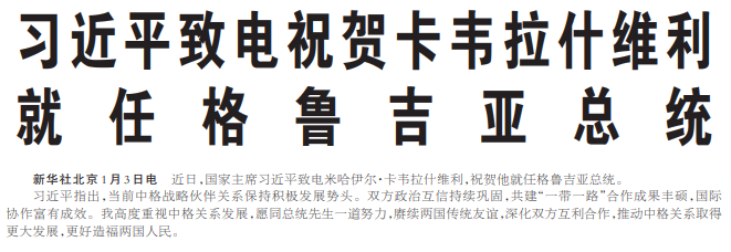 近日,国家主席习近平致电米哈伊尔·卡韦拉什维利,祝贺他就任格鲁吉亚总统。(今日《人民日报》1版)