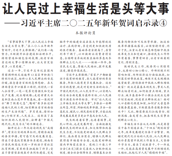 “家事国事天下事,让人民过上幸福生活是头等大事。”在二〇二五年新年贺词中,习近平主席强调:“我们要一起努力,不断提升社会建设和治理水平,持续营造和谐包容的氛围,把老百姓身边的大事小情解决好,让大家笑容更多、心里更暖。”(今日《人民日报》1版)