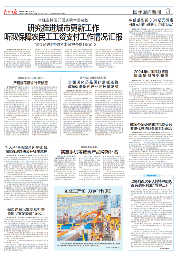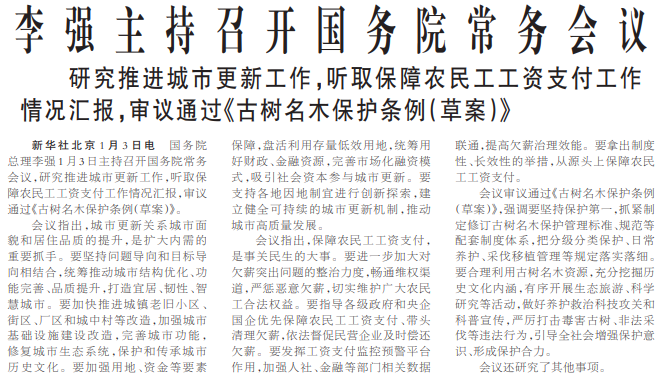 国务院总理李强1月3日主持召开国务院常务会议,研究推进城市更新工作,听取保障农民工工资支付工作情况汇报,审议通过《古树名木保护条例(草案)》。(今日《人民日报》1版)