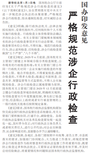 国务院办公厅日前印发《关于严格规范涉企行政检查的意见》,旨在贯彻落实党中央关于进一步规范涉企执法的决策部署,严格规范涉企行政检查,坚决遏制乱检查,切实减轻企业负担。(今日《人民日报》1版)