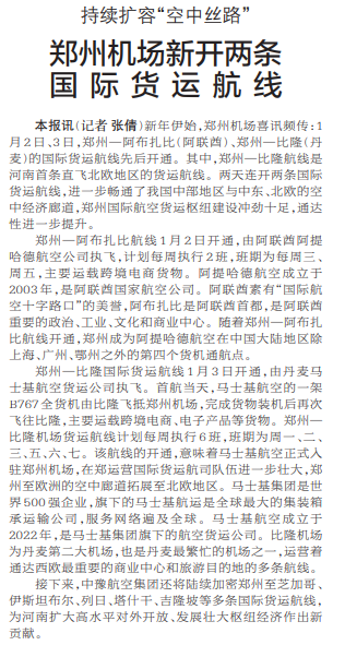 新年伊始,郑州机场喜讯频传:1月2日、3日,郑州—阿布扎比(阿联酋)、郑州—比隆(丹麦)的国际货运航线先后开通。其中,郑州—比隆航线是河南首条直飞北欧地区的货运航线。两天连开两条国际货运航线,进一步畅通了我国中部地区与中东、北欧的空中经济廊道,郑州国际航空货运枢纽建设冲劲十足,通达性进一步提升。(今日《郑州日报》1版)