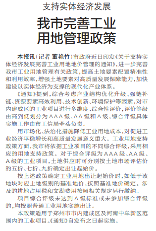 市政府近日印发《关于支持实体经济发展完善工业用地地价管理的通知》,进一步完善我市工业用地管理有关政策,提高土地要素配置精准性和利用效率,增强土地要素对高质量发展保障能力,加快建设以实体经济为支撑的现代化产业体系。(今日《郑州日报》1版)