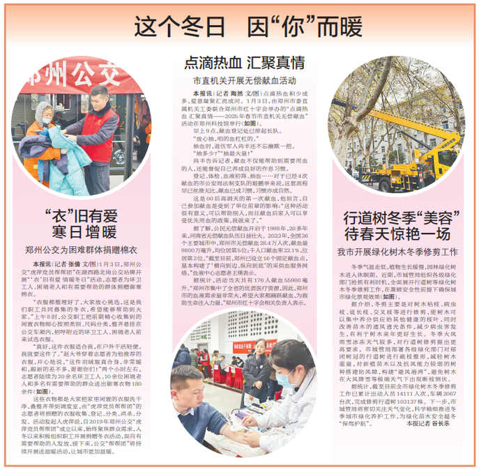 1月3日,郑州公交“虎萍党员帮帮团”在湖西路北岗公交站牌开展“‘衣’旧有爱 情暖冬日”活动,志愿者为环卫工人、困境老人和有需要帮助的群体捐赠御寒棉衣。(今日《郑州日报》2版)
