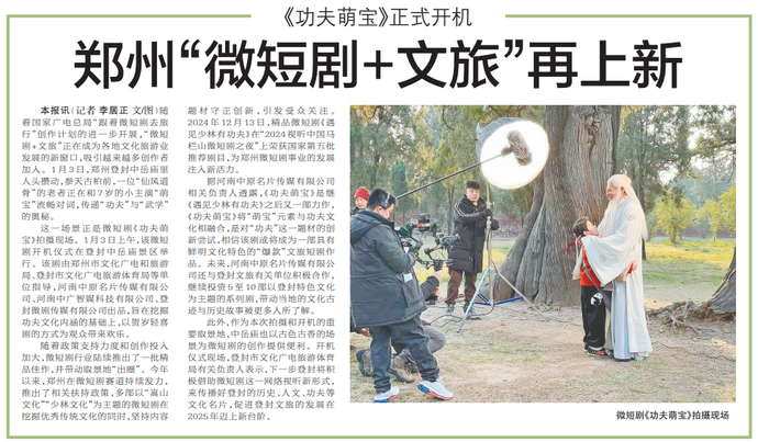 随着国家广电总局“跟着微短剧去旅行”创作计划的进一步开展,“微短剧+文旅”正在成为各地文化旅游业发展的新窗口,吸引越来越多创作者加入。1月3日,郑州登封中岳庙里人头攒动,参天古柏前,一位“仙风道骨”的老者正在和7岁的小主演“萌宝”流畅对词,传递“功夫”与“武学”的奥秘。(今日《郑州日报》4版)