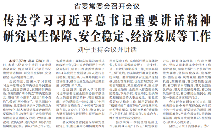 1月3日,省委书记刘宁主持召开省委常委会会议,传达学习习近平总书记重要讲话精神,研究民生保障、安全稳定、经济发展等工作。(今日《河南日报》1版)