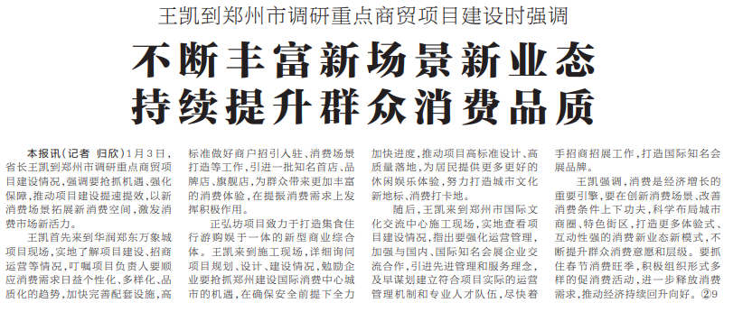 1月3日,省长王凯到郑州市调研重点商贸项目建设情况,强调要抢抓机遇、强化保障,推动项目建设提速提效,以新消费场景拓展新消费空间,激发消费市场新活力。(今日《河南日报》1版)