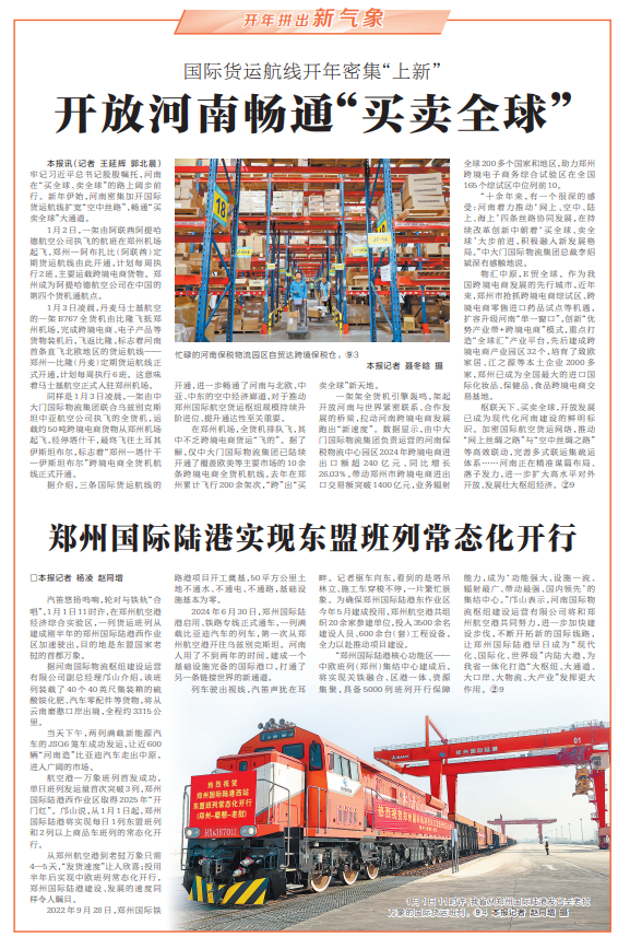 牢记习近平总书记殷殷嘱托,河南在“买全球、卖全球”的路上阔步前行。新年伊始,河南密集加开国际货运航线扩宽“空中丝路”,畅通“买卖全球”大通道。(今日《河南日报》2版)