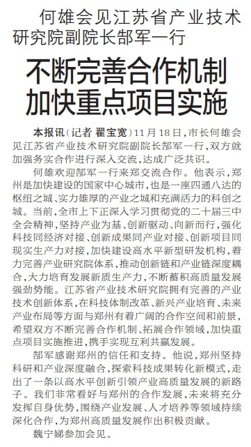 11月18日,市长何雄会见江苏省产业技术研究院副院长郜军一行,双方就加强务实合作进行深入交流,达成广泛共识。(今日《郑州日报》1版)