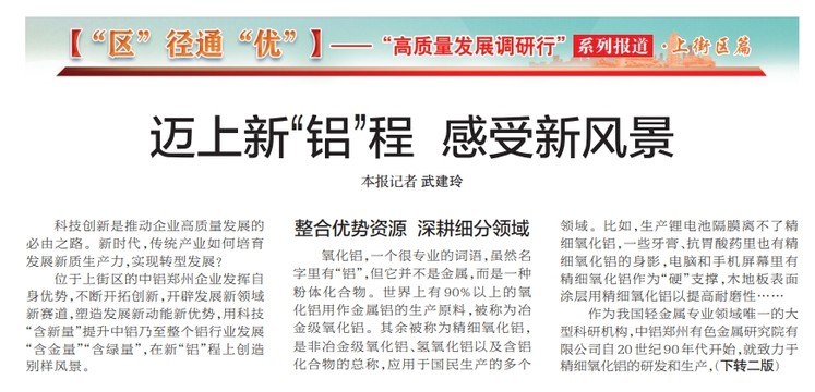 位于上街区的中铝郑州企业发挥自身优势,不断开拓创新,开辟发展新领域新赛道,塑造发展新动能新优势,用科技“含新量”提升中铝乃至整个铝行业发展“含金量”“含绿量”,在新“铝”程上创造别样风景。(今日《郑州日报》1版、2版)