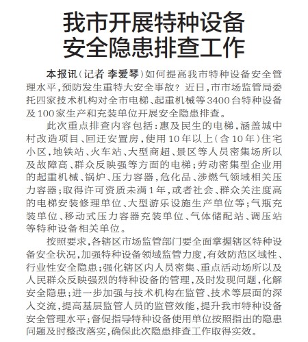 我市开展特种设备安全隐患排查工作