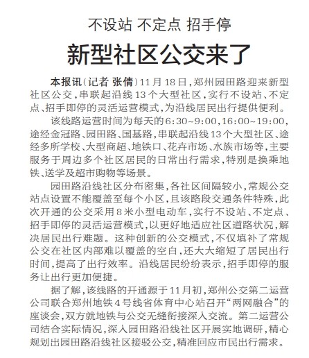 11月18日,郑州园田路迎来新型社区公交,串联起沿线13个大型社区,实行不设站、不定点、招手即停的灵活运营模式,为沿线居民出行提供便利。(今日《郑州日报》2版)