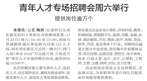 记者昨日从郑东新区组织人事和社会保障局获悉,11月23日(周六)10:00至13:00,该局与祭城路街道办事处联合河南123人才网,将在郑东新区万达坊一楼大厅(西门入场)举办2024“万众就万岗 万岗进万家”青年人才专场招聘会活动,提供岗位超10100个。(今日《郑州日报》2版)