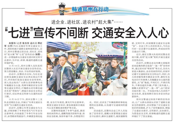 为扎实做好冬季交通安全工作,预防和减少道路交通事故的发生,近日,郑州交警通过进企业、进社区、进农村“赶大集”等“七进”宣传活动,进一步增强群众交通安全意识和文明守法意识,为平安、和谐、畅通的道路交通环境护航。(今日《郑州日报》5版)