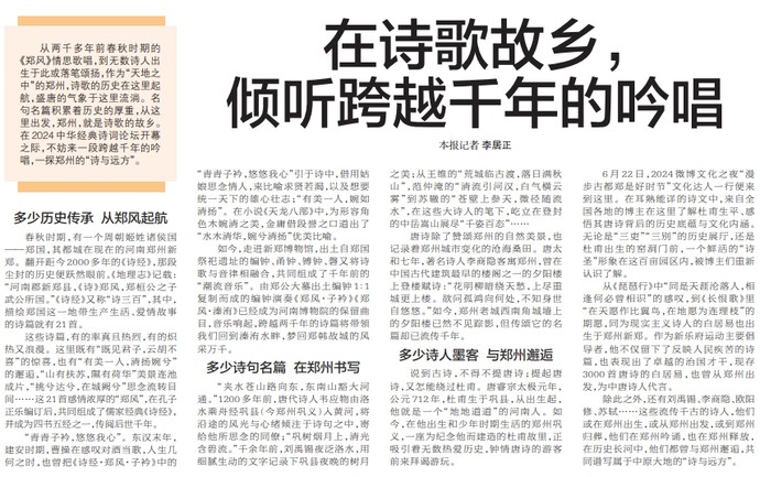 从两千多年前春秋时期的《郑风》情思歌唱,到无数诗人出生于此或落笔颂扬,作为“天地之中”的郑州,诗歌的历史在这里起航,盛唐的气象于这里流淌。名句名篇积累着历史的厚重,从这里出发,郑州,就是诗歌的故乡。在2024中华经典诗词论坛开幕之际,不妨来一段跨越千年的吟唱,一探郑州的“诗与远方”。(今日《郑州日报》8版)