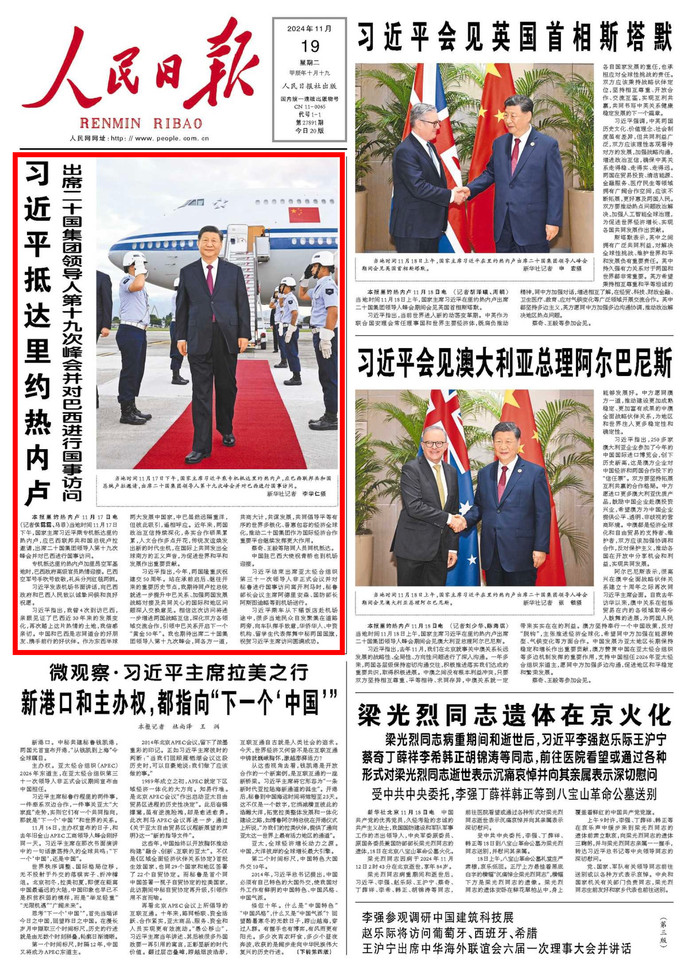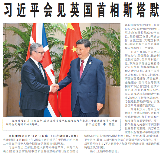 当地时间11月18日上午,国家主席习近平在里约热内卢出席二十国集团领导人峰会期间会见英国首相斯塔默。(今日《人民日报》1版)